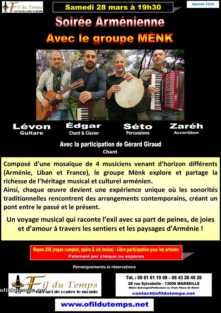 Samedi 28 mars à 19h30 : Musique et chants d’Arménie avec le groupe Mènk https://drive.google.com/file/d/1Zo6PxX2KQB8i_c_lEMUzXscvQ-nx5rLf/view
