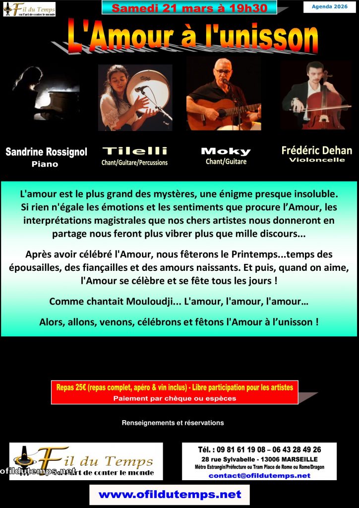 Samedi 21 mars à 19h30 : L’Amour à l’unisson – Duo/voix, piano, violoncelle, guitare, percussions